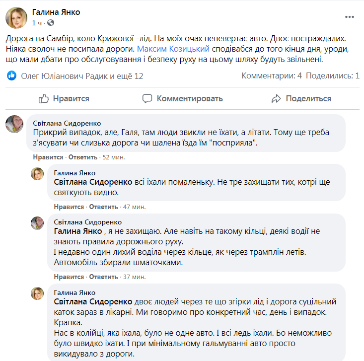 «Дорога на Самбір, коло Крижової – лід. На моїх очах перевертає авто. Двоє постраждалих. Ніяка сволоч не посипала дороги. Максим Козицький сподіваюся до того кінця дня, уроди, що мали дбати про обслуговування і безпеку руху на цьому шляху будуть звільнені», – зазначається у повідомленні.