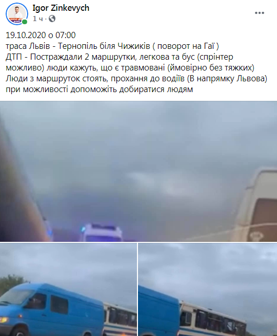 «19.10.2020 о 07:00. Траса Львів – Тернопіль біля Чижиків (поворот на Гаї) ДТП. Постраждали 2 маршрутки, легкова та бус (“Спрінтер”, можливо). Люди кажуть, що є травмовані (ймовірно без тяжких). Люди з маршруток стоять, прохання до водіїв (в напрямку Львова) при можливості допоможіть добиратися людям», – повідомляє Зінкевич, який оприлюднив світлини з місця події.