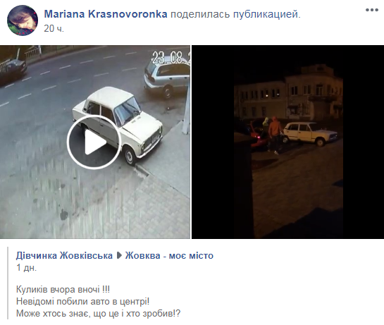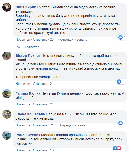 – “Це місцевому пияку побили авто щоб не їздив п’яний. Якщо це той самий ідіот, якого п’яним з малою дитиною в Жовкві 2 роки тому ловили поліція, (авто схоже) а його жінка в цей час родила…..То правильно хлопці зробили”;