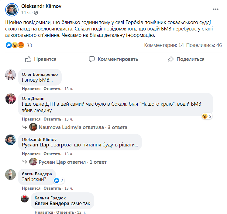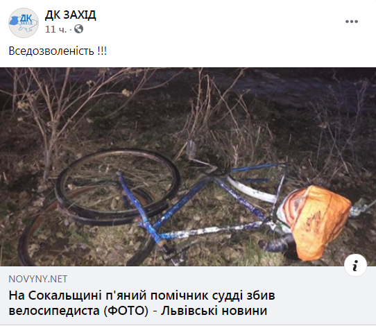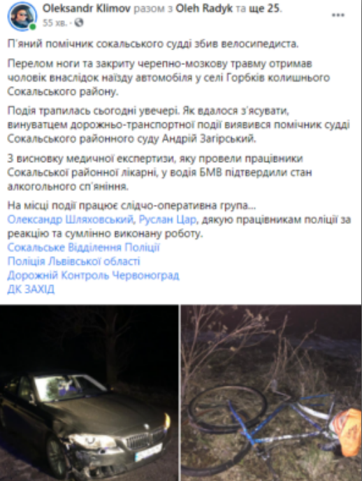 “Щойно повідомили, що близько години тому у селі Горбків помічник сокальського судді скоїв наїзд на велосипедиста. Свідки події повідомляють, що водій БМВ перебуває у стані алкогольного сп’яніння. Чекаємо на більш детальну інформацію”, – йдеться у дописі.