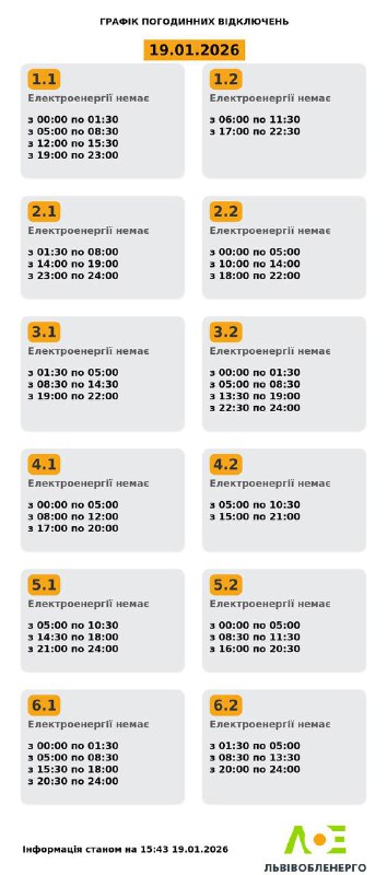 На Львівщині пʼятий раз оновили графіки на понеділок
