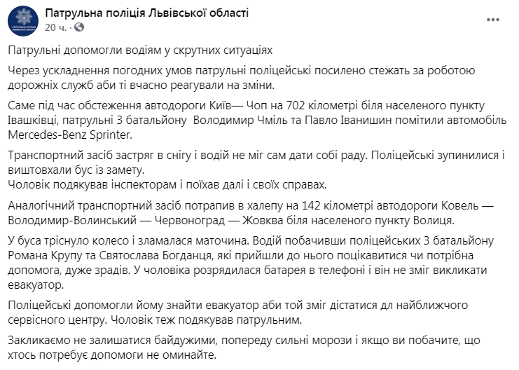Як зазначається, «під час обстеження автодороги Київ— Чоп на 702 кілометрі біля населеного пункту Івашківці, патрульні помітили автомобіль Mercedes-Benz Sprinter. Транспортний засіб застряг в снігу і водій не міг сам дати собі раду. Поліцейські зупинилися і виштовхали бус із замету. Чоловік подякував інспекторам і поїхав далі у своїх справах».