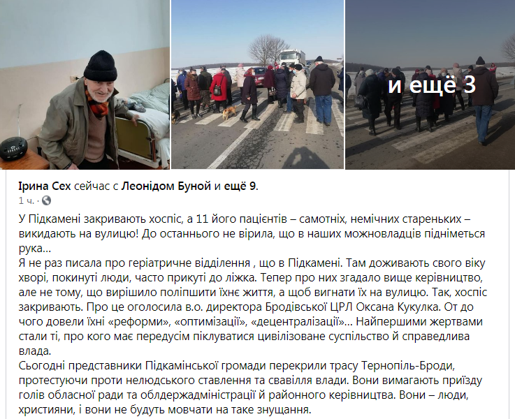 «Я не раз писала про геріатричне відділення, що в Підкамені. Там доживають свого віку хворі, покинуті люди, часто прикуті до ліжка. Тепер про них згадало вище керівництво, але не тому, що вирішило поліпшити їхнє життя, а щоб вигнати їх на вулицю. Так, хоспіс закривають. Про це оголосила в.о. директора Бродівської ЦРЛ Оксана Кукулка. От до чого довели їхні «реформи», «оптимізації», «децентралізації»… Найпершими жертвами стали ті, про кого має передусім піклуватися цивілізоване суспільство й справедлива влада», – пише Сех.