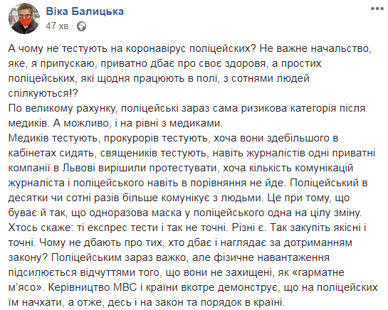 «А чому не тестують на коронавірус поліцейских? Не важне начальство, яке, я припускаю, приватно дбає про своє здоров’я, а простих поліцейських, які щодня працюють в полі, з сотнями людей спілкуються!? По великому рахунку, поліцейські зараз сама ризикова категорія після медиків. А можливо, і на рівні з медиками», – зазначила у своєму дописі Балицька.