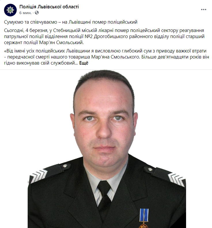 «Сумуємо та співчуваємо – на Львівщині помер поліцейський. Сьогодні, 4 березня, у Стебницькій міській лікарні помер поліцейський сектору реагування патрульної поліції відділення поліції №2 Дрогобицького районного відділу поліції старший сержант поліції Мар’ян Смольський», – зазначається у повідомленні.