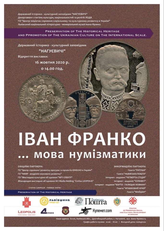 Сьогодні, 16 жовтня 2020 року у приміщенні Державного історико-культурного заповідника «Нагуєвичі» відбудеться відкриття нумізматичного мистецького проєкту та промоція культурної спадщини України «Іван Франко – мова нумізматики». Про це ІВ Четверта студія повідомив керуючий партнер ГО «Центр ініціатив сприяння соціальному та культурному розвитку в Україні» Роман Білявський.