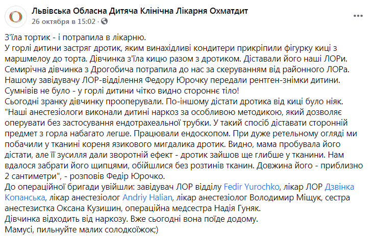 На Львівщині дитина з’їла тортик і потрапила в лікарню. У горлі дитини застряг дротик, яким винахідливі кондитери прикріпили фігурку киці з маршмелоу до торта. Дівчинка з’їла кицю разом з дротиком. Діставали його ЛОРи львівської дитячої лікарні ОХМАДИТ.