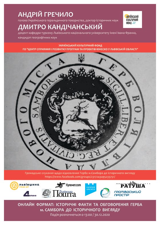 Громадська організація «Центр сприяння і розвитку програм та проєктів ЮНЕСКО у Львівській області» за підтримки Українського культурного фонду та офіційних партнерів: ГО «Центр промоції міжнародних соціальних та культурних проєктів ЮНЕСКО в Україні» запрошують 30 грудня 2020 року усіх зацікавлених до онлайн обговорення щодо відновлення Герба м.Самбора до історичного вигляду. За посиланням: https://www.facebook.com/groups/2317243495233751/ Серед українських міських гербів одним із найдавніших є символ Самбора.