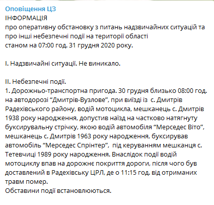 Як пише «Четверта студія», у департаменті цивільного захисту Львівської ОДА повідомили, що 30 грудня близько 08:00 год. на автодорозі “Дмитрів-Вузлове”, при виїзді із с. Дмитрів Радехівського району, водій мотоцикла, мешканець с. Дмитрів 1938 року народження, допустив наїзд на частково натягнуту буксирувальну стрічку, якою водій автомобіля “Мерседес Віто”, мешканець с. Дмитрів 1963 року народження, буксирував автомобіль “Мерседес Спрінтер”, під керуванням мешканця с. Тетевчиці 1989 року народження.
