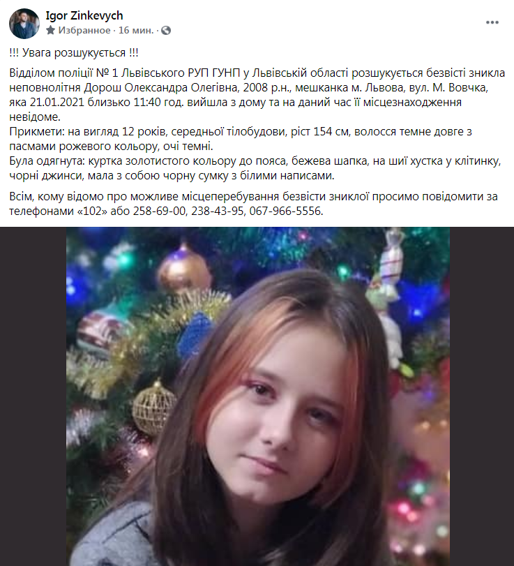 «Увага розшукується! Відділом поліції № 1 Львівського РУП ГУНП у Львівській області розшукується безвісті зникла неповнолітня Дорош Олександра Олегівна, 2008 р.н., мешканка м. Львова, вул. М. Вовчка, яка 21.01.2021 близько 11:40 год. вийшла з дому та на даний час її місцезнаходження невідоме.