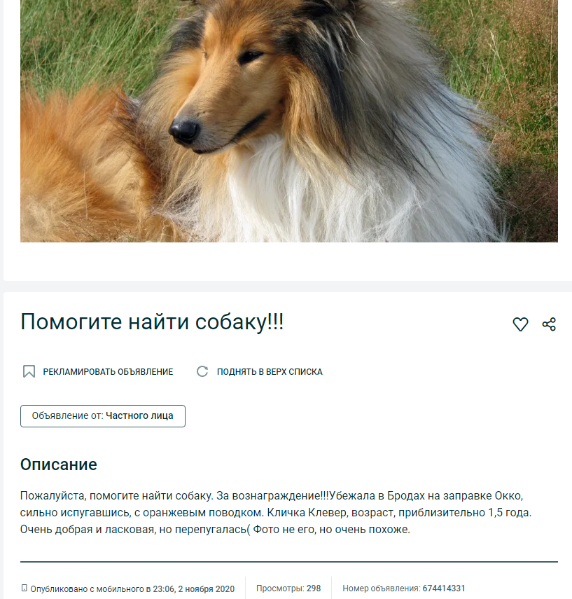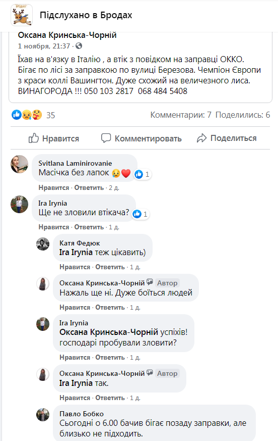 «Їхав на в’язку в Італію, а втік з повідком на заправці «ОККО». Бігає по лісі за заправкою по вулиці Березова. Чемпіон Європи з краси коллі Вашингтон. Дуже схожий на величезного лиса. Винагорода! 050 103 2817; 068 484 5408.», – зазначається у дописі на сторінці спільноти «Підслухано в Бродах» у ФБ.