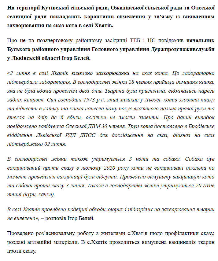 Як пише «Четверта студія» з посиланням на «Буський медіа-портал», на території Кутівської сільської ради, Ожидівської сільської ради та Олеської селищної ради накладають карантинні обмеження у зв’язку із виявленням захворювання на сказ кота в селі Хватів.