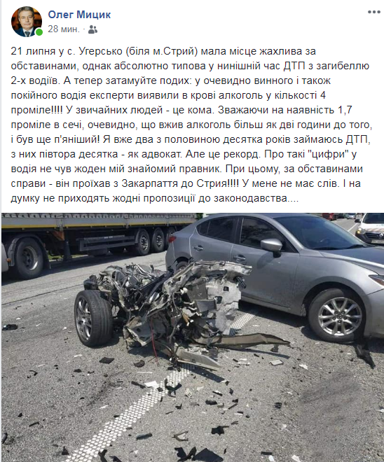 “21 липня у с. Угерсько (біля м.Стрий) мала місце жахлива за обставинами, однак абсолютно типова у нинішній час ДТП з загибеллю 2-х водіїв. А тепер затамуйте подих: у очевидно винного і також покійного водія експерти виявили в крові алкоголь у кількості 4 проміле! У звичайних людей – це кома. Зважаючи на наявність 1,7 проміле в сечі, очевидно, що вжив алкоголь більш як дві години до того, і був ще п’яніший! Я вже два з половиною десятка років займаюсь ДТП, з них півтора десятка – як адвокат. Але це рекорд. Про такі “цифри” у водія не чув жоден мій знайомий правник. При цьому, за обставинами справи – він проїхав з Закарпаття до Стрия! У мене не має слів. І на думку не приходять жодні пропозиції до законодавства….”, – написав Олег Мицик.