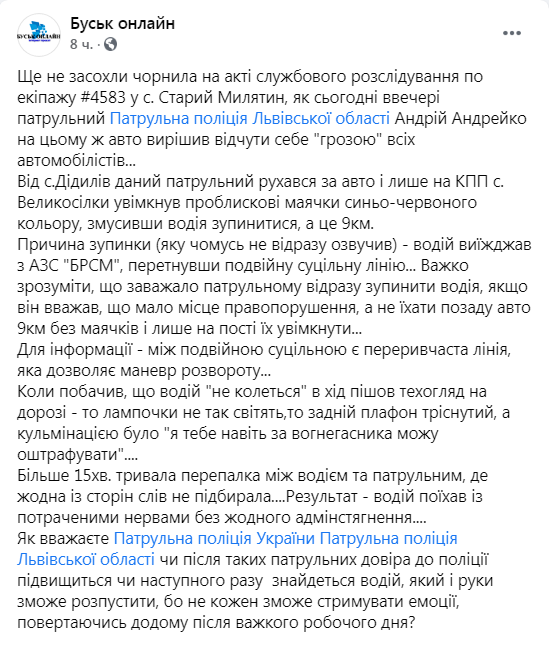 «Ще не засохли чорнила на акті службового розслідування по екіпажу #4583 у с. Старий Милятин, як ввечері 10 жовтня патрульний Патрульної поліції Львівської області