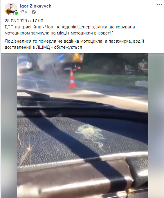 28.08.2020 о 17:00ДТП на трасі Київ – Чоп, неподалік Цеперів, жінка що керувала мотоциклом загинула на місці ( мотоцикли в кюветі )Як дізналися то померла не водійка мотоцикла, а пасажирка, водій доставлений в ЛШМД – обстежується