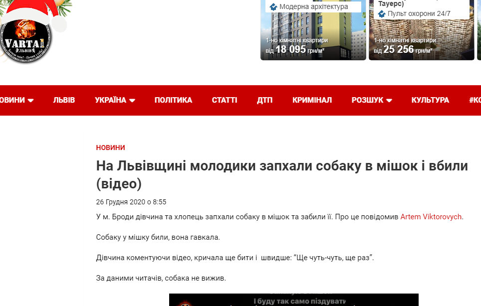Як зазначається, у м. Броди дівчина та хлопець запхали собаку в мішок та забили її. Собаку у мішку били, вона гавкала. Дівчина коментуючи відео, кричала ще бити і швидше: “Ще чуть-чуть, ще раз”. За даними читачів, собака не вижив.
