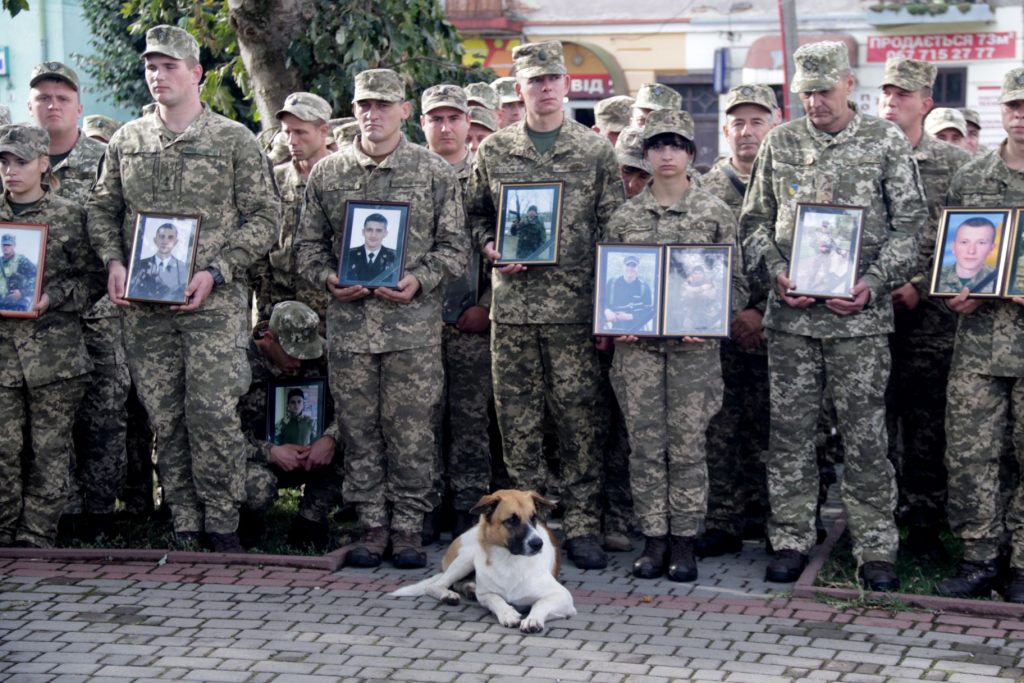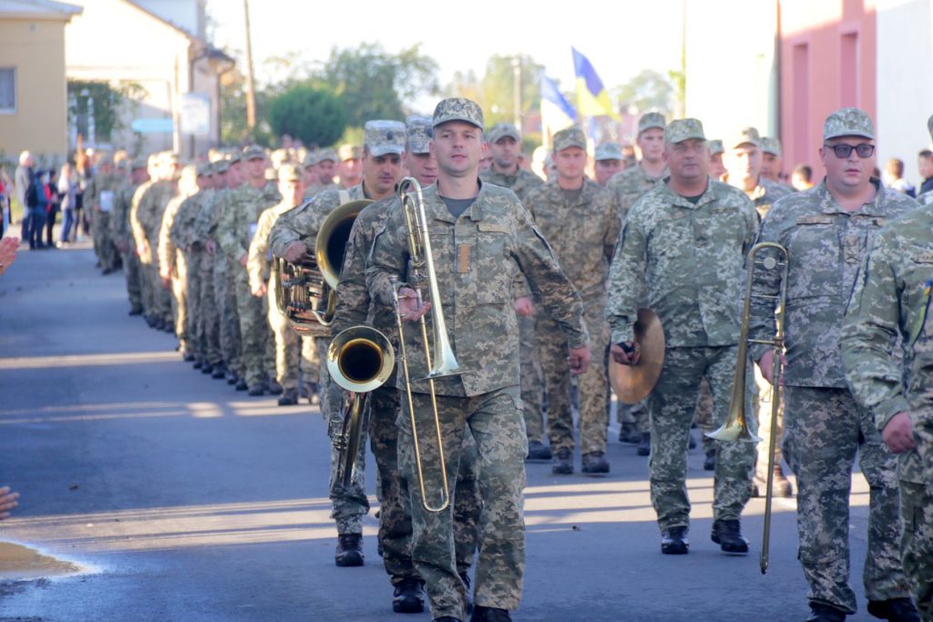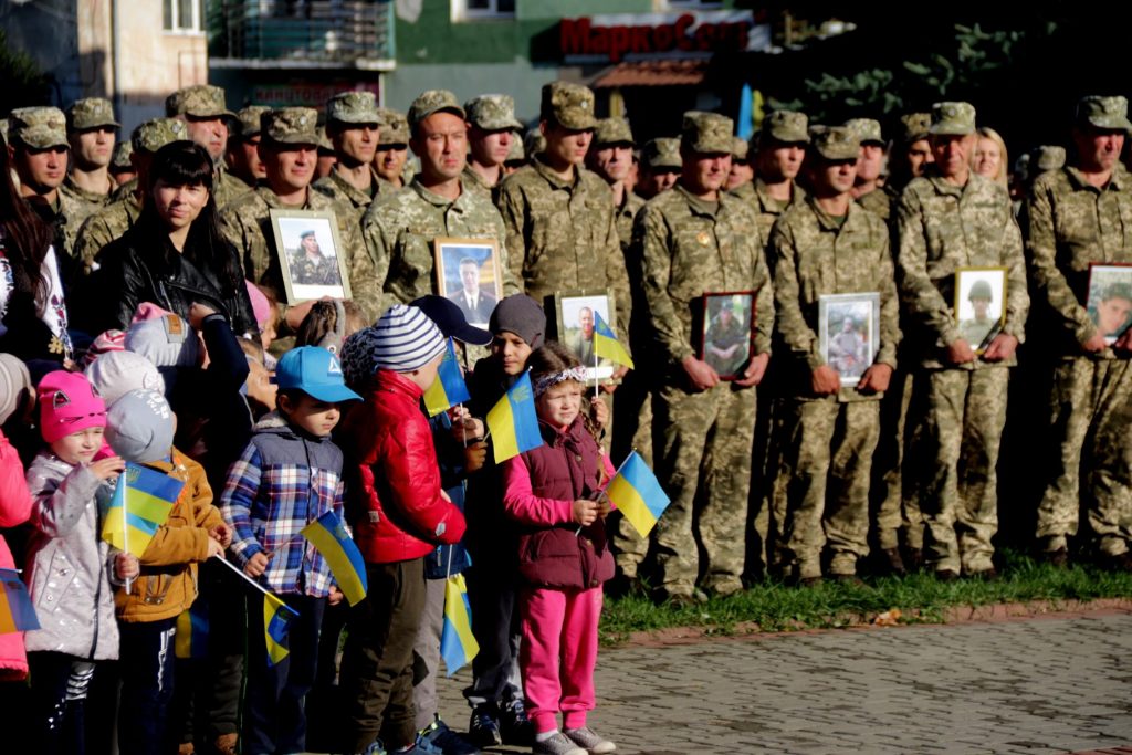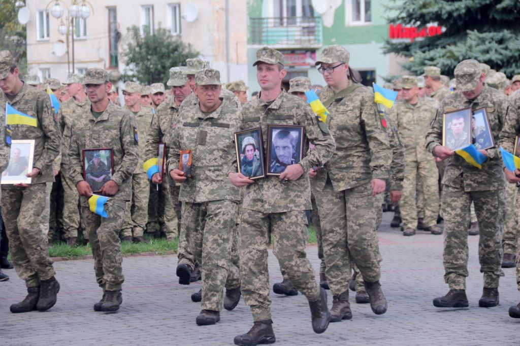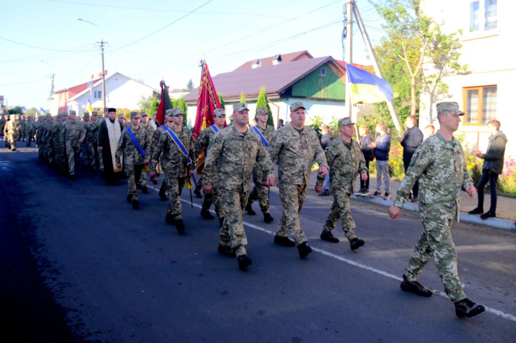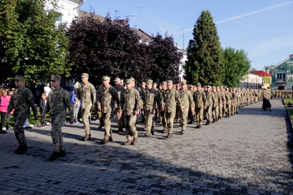 Військові пройшли урочистою ходою від місця постійної дислокації бригади до площі Ринок у місті Яворів. Армійці несли у руках портрети побратимів, які загинули на Сході за час війни.