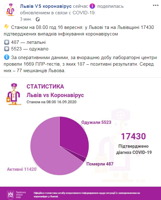 У Львівській області, станом на 08.00 год 16 вересня, 17430 підтверджених випадків інфікування коронавірусом, 487 — летальні.