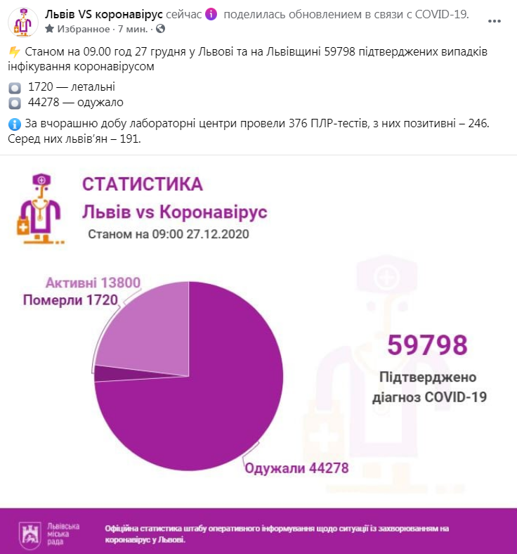 У Львівській області, станом на 09.00 год 27 грудня у Львові, 59798 підтверджених випадків інфікування коронавірусом, 1720 — летальні, 44278 — одужало.