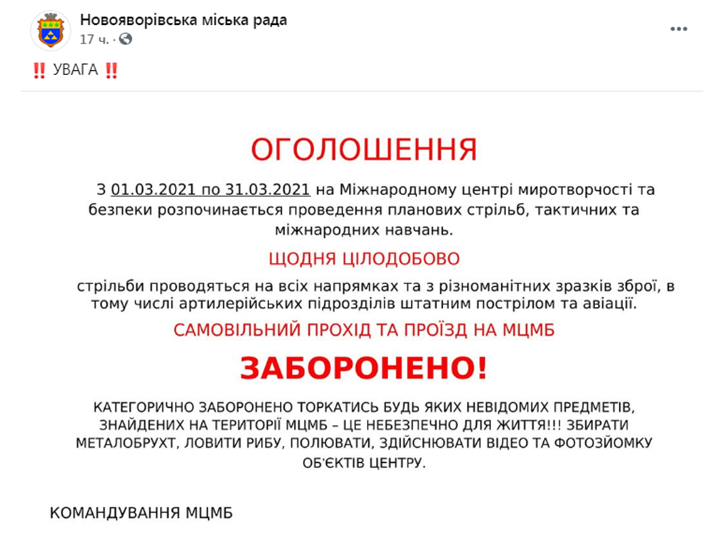 На Львівщині, з 1 березня 2021 року по 31 березня 2021 року на Міжнародному центрі миротворчості та безпеки розпочинається проведення планових стрільб, тактичних та міжнародних навчань.