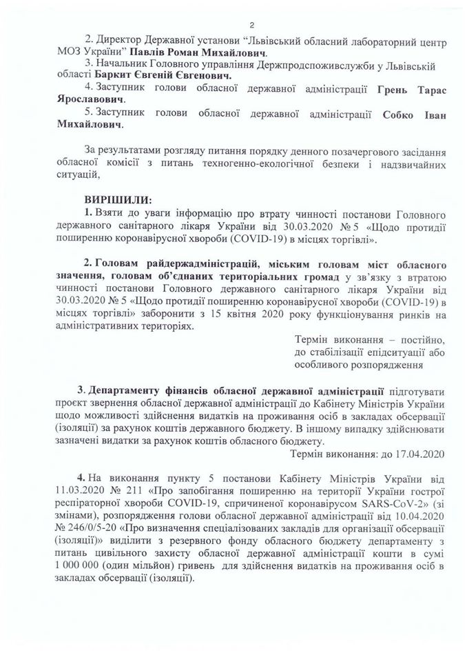 Головам райдержадміністрацій, міським головам міст обласного значення, головам об’єднаних територіальних громад заборонити з 15 квітня функціонування ринків на адміністративних територіях, – зазначено у протоколі засідання, прийнятому 15 квітня.