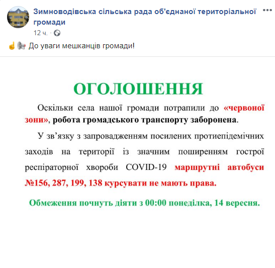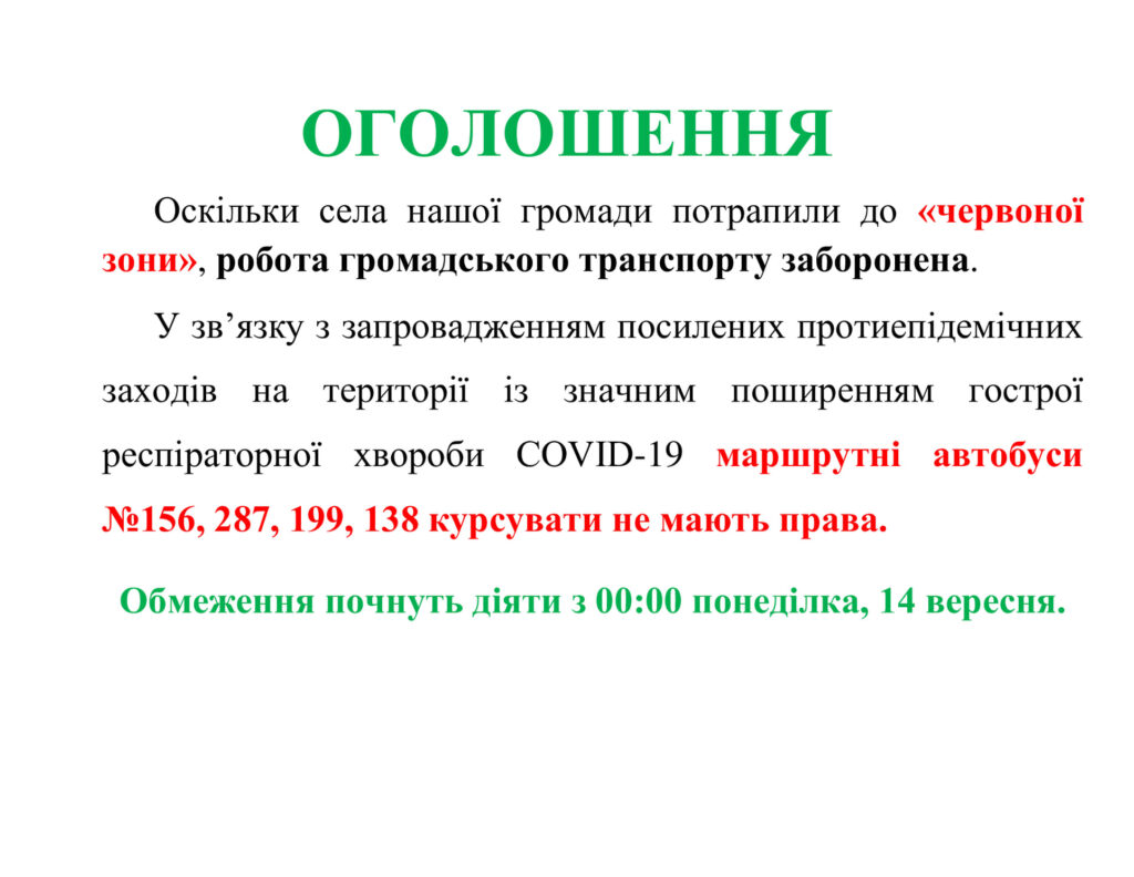 Як пише “Четверта студія”, у соцмережах оприлюднено відповідні оголошення про заборону курсування маршрутних автобусів до населених пунктів “червоної зони”.