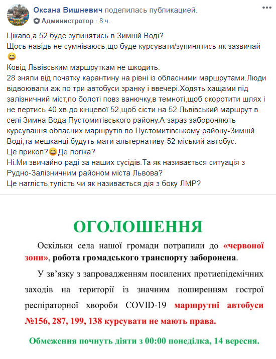 “Цікаво,а 52 буде зупинятись в Зимній Воді? Щось навідь не сумніваюсь, що буде курсувати/зупинятись як зазвичай. Ковід Львівським маршруткам не шкодить. 28 зняли від початку карантину на рівні із обласними маршрутами. Люди відвоювали аж по три автобуси зранку і ввечері. Ходять хащами під залізничний міст, по болоті повз ванючку, в темноті, щоб скоротити шлях і не пертись 40 хв.до кінцевої 52, щоб сісти на 52 Львівський маршрут в селі Зимна Вода Пустомитівського району. А зараз забороняють курсування обласних маршрутів по Пустомитівському району-Зимній Воді,та мешканці будуть мати альтернативу-52 міський автобус. Це прикол? Де логіка? Ні. Ми звичайно раді за наших сусідів. Та як називається ситуація з Рудно-Залізничним районом міста Львова? Це наглість,тупість чи як називається дія з боку ЛМР?”, – зазначається у дописі на сторінці “Громалда Рудно” у ФБ.