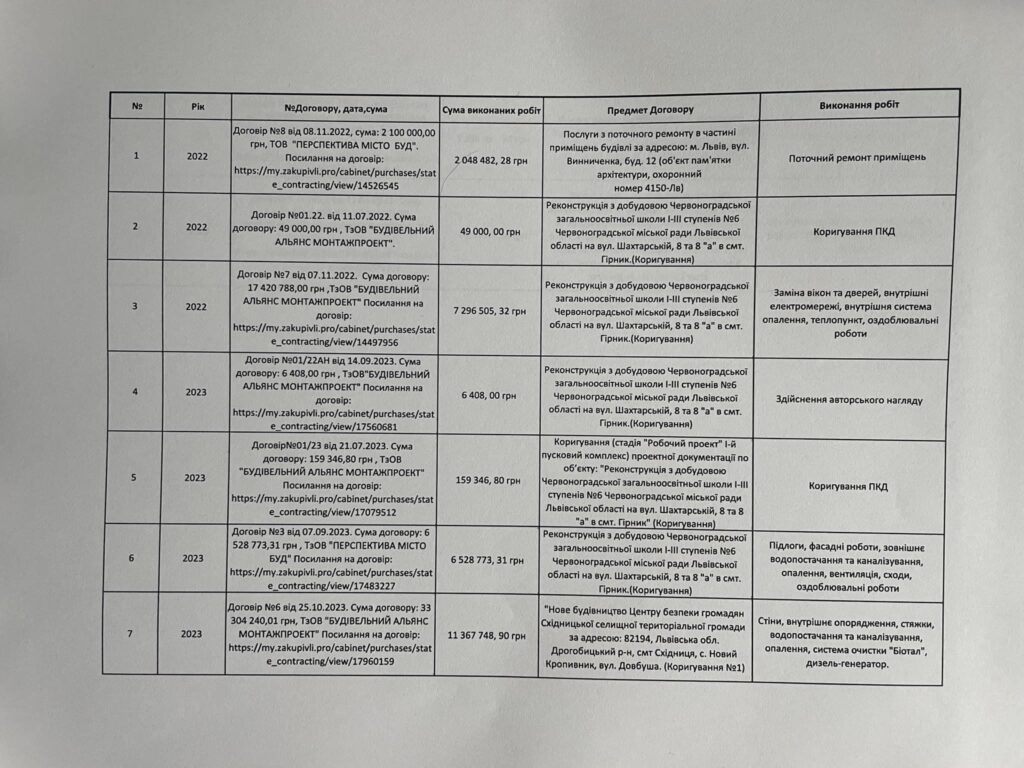 Особливо Комісію зацікавили договори укладені УКБ ЛОДА Львівська обласна державна адміністрація з фірмами ТОВ «Перспектива Місто Буд» та ТзОВ «Будівельний Альянс Монтажпроєкт» Романа Ігоровича Гринкевича під час війни (кількість укладених договорів у фото)”, – повідомив у Фейсбуці депутат Юрій Раделицький.