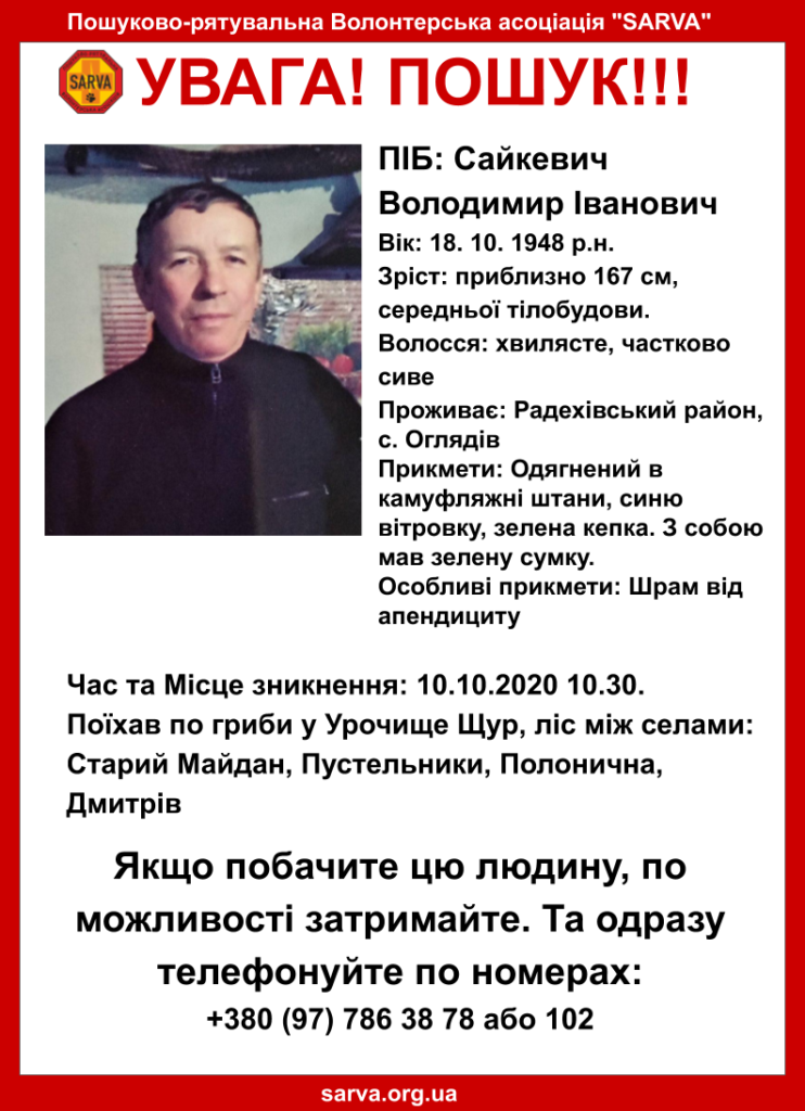 «Увага пошук. Сайкевич Володимир Іванович, 1948 р.н. Приблизно 167 см, середньої тілобудови. Проживає: Радехівський район, с. Оглядів. Час та місце зникнення: 10.10.2020 10.30. Поїхав по гриби у Урочище Щур, ліс між селами: Старий Майдан, Пустельники, Полонична, Дмитрів», – зазначається у повідомленні.