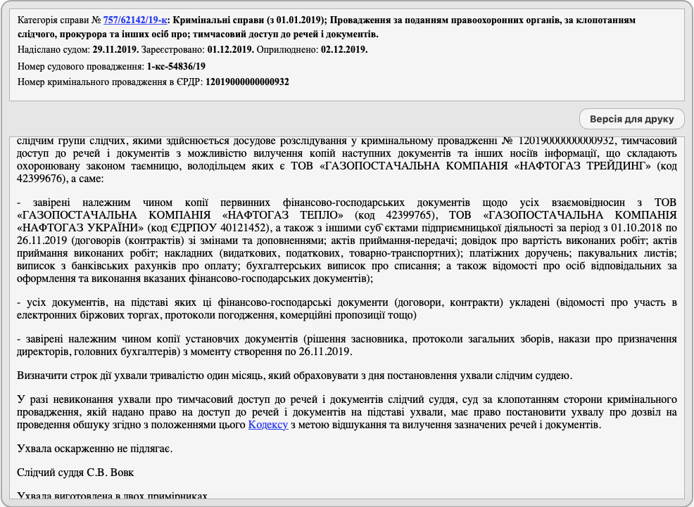 Виявляється, ще з 2019 року у провадженні Головного слідчого управління Національної поліції України знаходиться кримінальне провадження, внесене до Єдиного реєстру досудових розслідувань за №12019000000000932, 30.09.2019, за ознаками вчинення кримінального правопорушення, передбаченого ч. 5 ст. 191 КК України. Серед іншого, мова в ухвалі суду йде про те, що слідчі мають всі підстави для додаткового вилучення всіх фінансових документів компаній “Нафтогаз” та “Нафтогаз-Тепло” з метою перевірки підозри щодо розробки та втілення злочинної схеми заволодіння майном НАК “Нафтогаз України”.