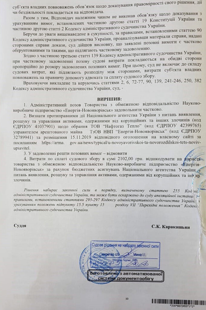Так і сталося. В п’ятницю, 4 вересня, Окружний Адміністративний суд Києва визнав призначення управителем компанії “Нафтогаз-Тепло” протиправним. Так само, як колись незаконно призначили ПП “Гарант-енерго М”.
