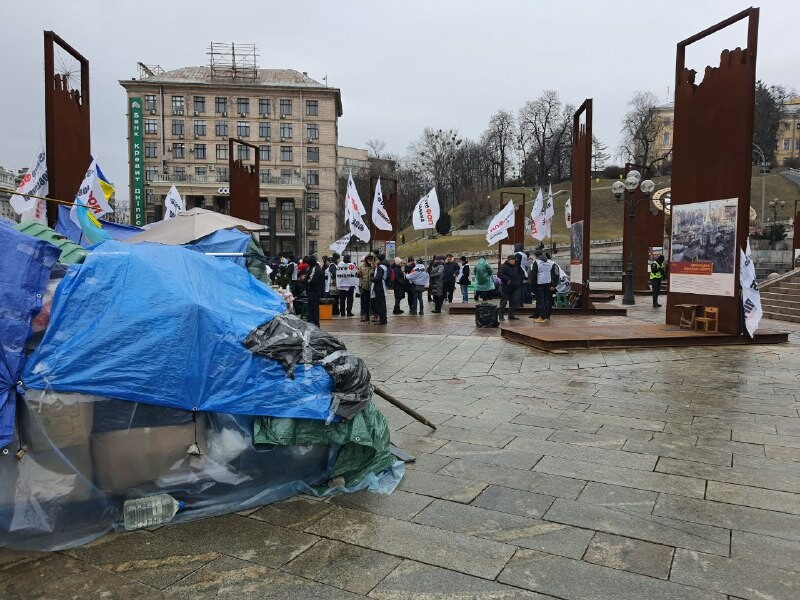 Як пише «Четверта студія» з посиланням на УНІАН, протест триває другий тиждень. Сьогодні на Майдані майже не видно правоохоронців. Там встановлено пункт для роздачі їжі, а також намет для ночівлі. Протестуючі провели ніч на Майдані, але є і такі, які прийшли сьогодні з ранку.