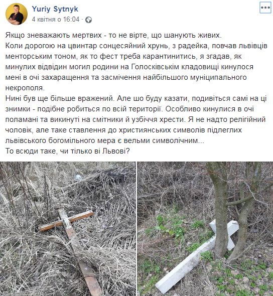 «Якщо зневажають мертвих – то не вірте, що шанують живих. Коли дорогою на цвинтар сонцесяйний хрунь, з радейка, повчав львівців менторським тоном, як то фест треба карантинитись, я згадав, як минулих відвідин могил родини на Голосківськім кладовищі кинулося мені в очі захаращення та засмічення найбільшого муніципального некрополя. Нині був ще більше вражений. Але що буду казати, подивіться самі на ці знимки – подібне робиться по всій території. Особливо кинулися в очі поламані та викинуті на смітники й узбіччя хрести. Таке ставлення до християнських символів підлеглих львівського богомільного мера є вельми символічним…», – зазначає у своєму дописі Юрій Ситник.