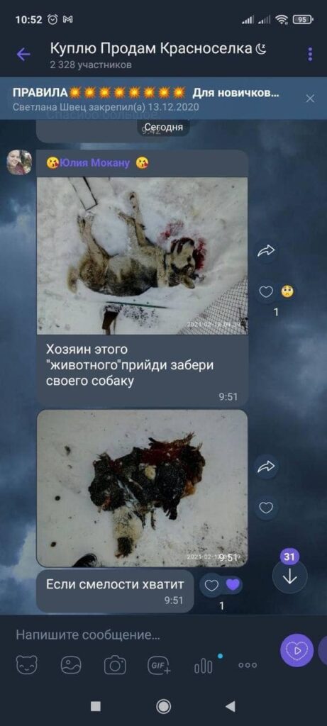 “Як і обіцяли ми не тільки тримаємо на контролі ситуацію з вбивством хаскі в селі Красносьолка, а й приймаємо безпосередню участь в процесі зібрання доказів, опитуванні свідків, транспортуванні тіла собаки до РВВС. Особа, яка хизувалася вбивством сусідської собаки зараз свою провину не визнає і дуже нервується з приводу того, що ситуація набрала розголосу. Кожен злочин проти тварин та природи завжди попаде в поле зору ГО ” Закон Природи” та в решті решт винні понесуть відповідальність”, — йдеться у дописі.