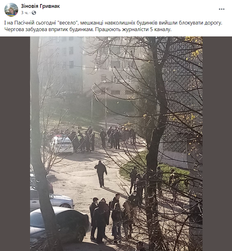 «І на Пасічній сьогодні “весело”, мешканці навколишніх будинків вийшли блокувати дорогу. Чергова забудова впритик будинкам. Працюють журналісти 5 каналу», – зазначається у дописі до світлин з місця події.