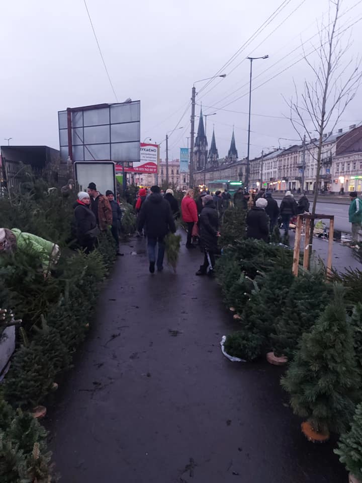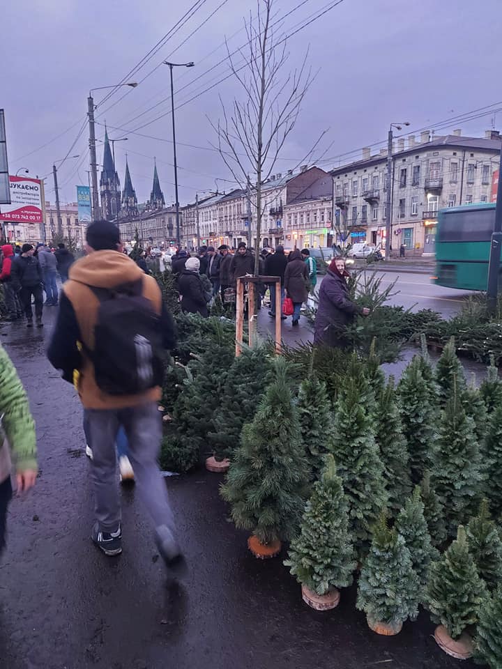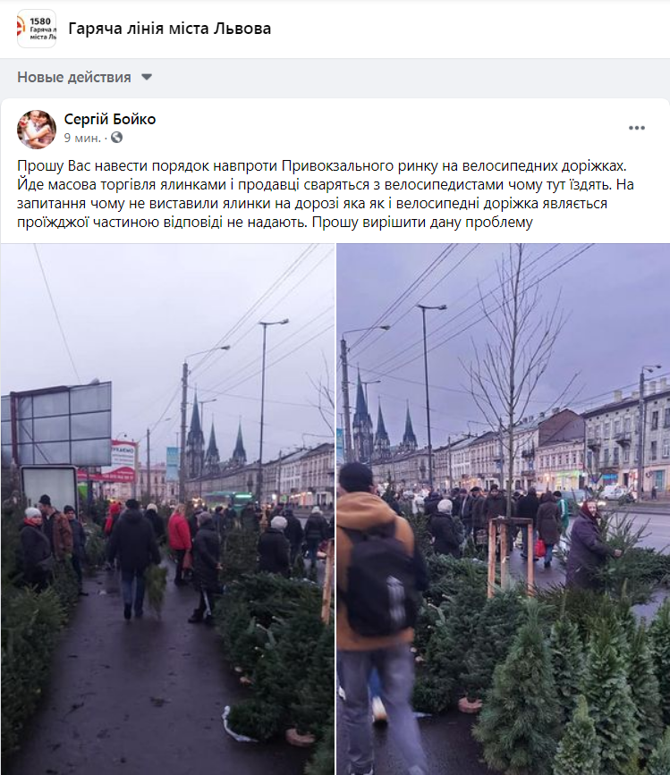 «Прошу навести порядок навпроти Привокзального ринку на велосипедних доріжках. Йде масова торгівля ялинками і продавці сваряться з велосипедистами чому тут їздять. На запитання чому не виставили ялинки на дорозі, яка як і велосипедна доріжка являється проїжджої частиною, відповіді не надають. Прошу вирішити дану проблему», – – зазначає у зверненні на «Гарячу лінію міста Львова» у ФБ Сергій Бойко.