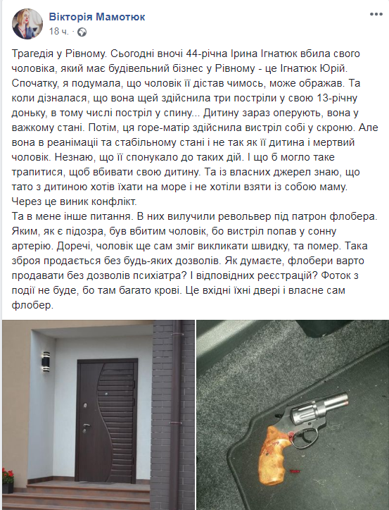 Як пише “РБК-Україна”, поранений 45-річний Юрій Ігнатюк ще встиг зателефонувати батькові, який і викликав поліцію. Але врятувати його не вдалося. А от 13-річна дочка з множинними пораненнями була доставлена в лікарню. Ірина також госпіталізована – вона намагалася порізати вени і вистрілила в скроню, але залишилася жива.