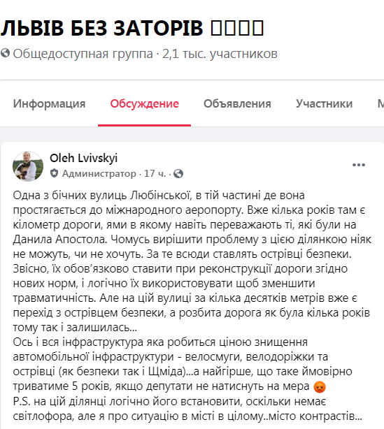 Як пише «Четверта студія», на сторінці спільноти «Львів без заторів», зокрема йдеться про одну із бічних вулиць Любінської.