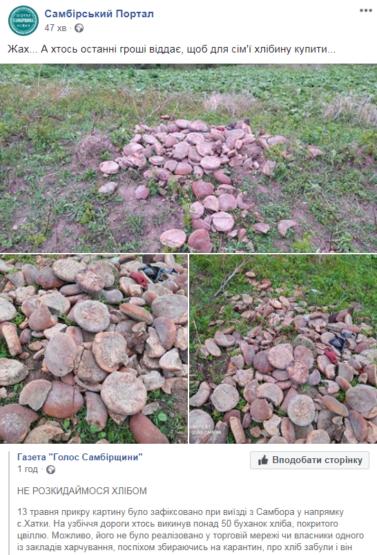 «13 травня прикру картину було зафіксовано при виїзді з Самбора у напрямку с.Хатки. На узбіччя дороги хтось викинув понад 50 буханок хліба, покритого цвіллю. Можливо, його не було реалізовано у торговій мережі чи власники одного із закладів харчування, поспіхом збираючись на карантин, про хліб забули і він зачерствів.
