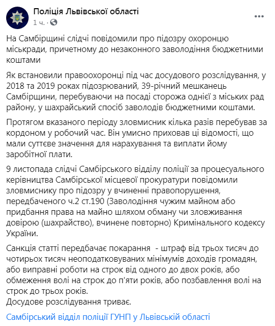 Як пише «Четверта студія», у відділі комунікації Головного управління Національної поліції у Львівській області повідомили, що як встановили правоохоронці під час досудового розслідування, у 2018 та 2019 роках підозрюваний, 39-річний мешканець Самбірщини, перебуваючи на посаді сторожа однієї з міських рад району, у шахрайський спосіб заволодів бюджетними коштами.