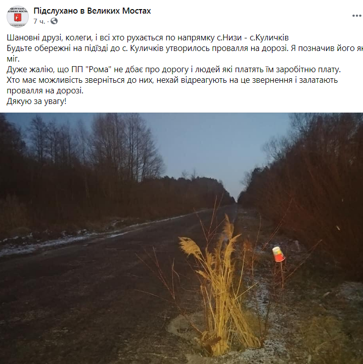 «Всі хто рухається по напрямку с.Низи – с.Куличків будьте обережні на підїзді до с. Куличків утворилось провалля на дорозі. Я позначив його як міг. Дуже жалію, що ПП “Рома” не дбає про дорогу і людей які платять їм заробітню плату. Хто має можливість зверніться до них, нехай відреагують на це звернення і залатають провалля на дорозі», – зазначається у дописі на сторінці спільноти «Підслухано в Великих Мостах» у ФБ.