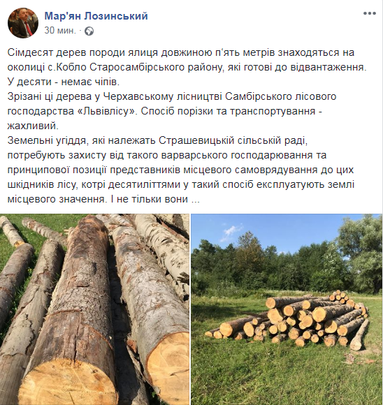 “Сімдесят дерев породи ялиця довжиною п‘ять метрів знаходяться на околиці с.Кобло Старосамбірського району, які готові до відвантаження. У десяти – немає чіпів. Зрізані ці дерева у Черхавському лісництві Самбірського лісового господарства «Львівлісу». Спосіб порізки та транспортування – жахливий. Земельні угіддя, які належать Страшевицькій сільській раді, потребують захисту від такого варварського господарювання та принципової позиції представників місцевого самоврядування до цих шкідників лісу, котрі десятиліттями у такий спосіб експлуатують землі місцевого значення. І не тільки вони…”, – зазначається у дописі Мар’яна Лозинського під світлинами з місця події.