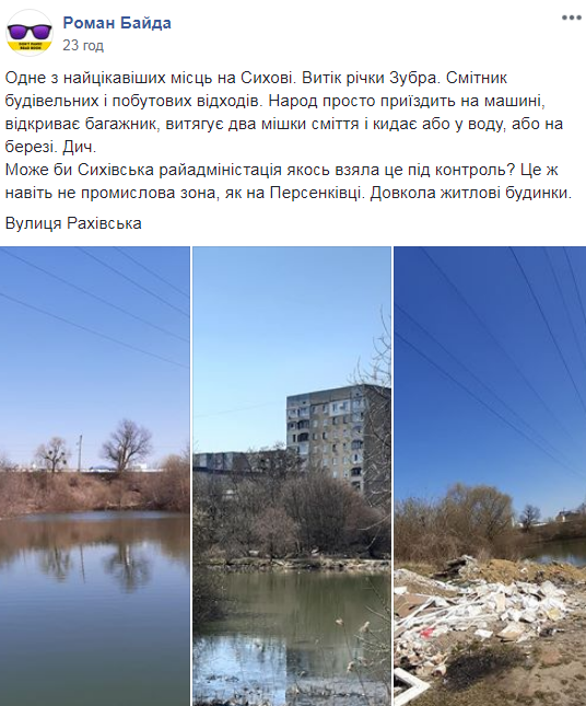 «Одне з найцікавіших місць на Сихові. Витік річки Зубра. Смітник будівельних і побутових відходів. Народ просто приїздить на машині, відкриває багажник, витягує два мішки сміття і кидає або у воду, або на березі. Дич. Може би Сихівська райадміністація якось взяла це під контроль? Це ж навіть не промислова зона, як на Персенківці. Довкола житлові будинки. Вулиця Рахівська», – зазначається у дописі під світлинами з місця події.