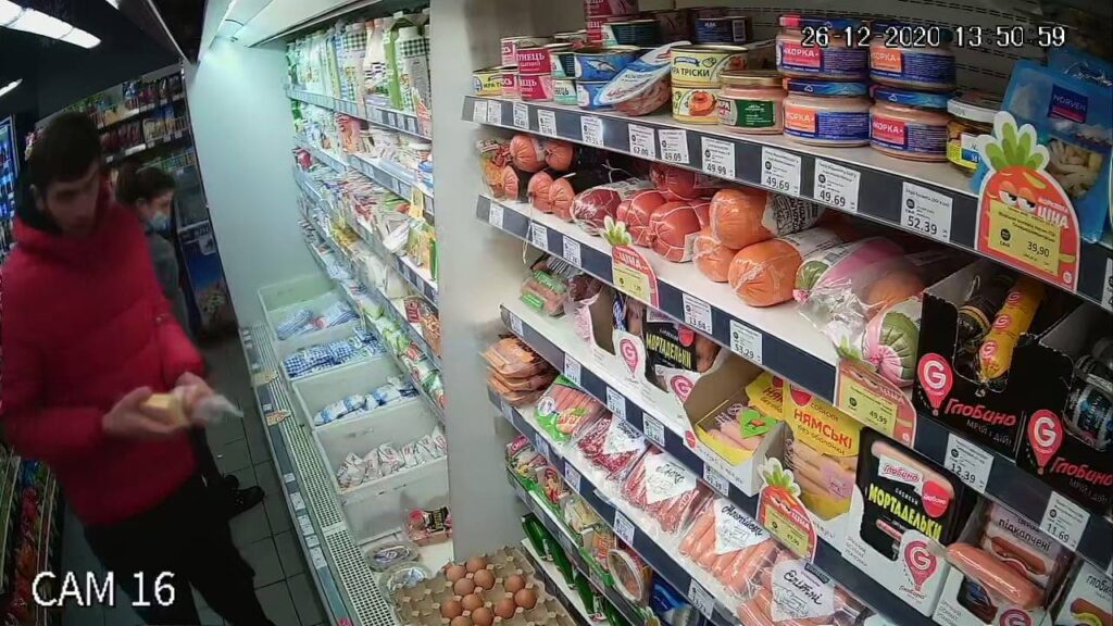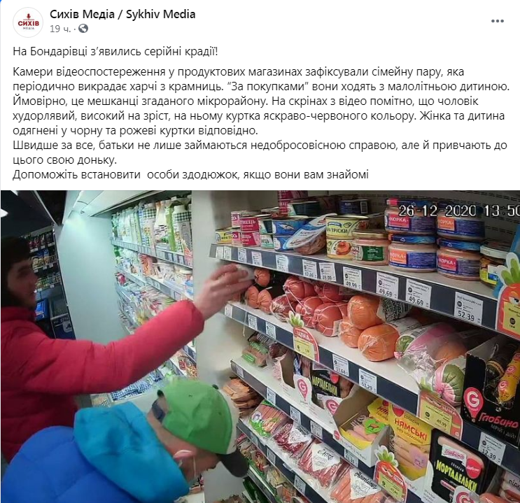 Як зазначається, камери відеоспостереження у продуктових магазинах зафіксували сімейну пару, яка періодично викрадає харчі з крамниць. “За покупками” вони ходять з малолітньою дитиною.