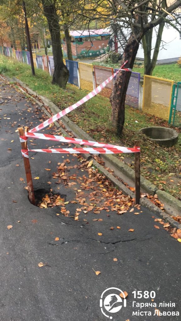 Про це розповіла жителька Сихівського району у фейсбук-спільноті “Гаряча лінія міста”. Адміністратор групи скерував звернення у ЛКП “Львівтеплоенерго”, працівники якого вже огородили небезпечну ділянку. Та повідомили, що ліквідують провалля до 13 листопада цього року», – зазначається у дописі, де оприлюднено світлини з місця події.