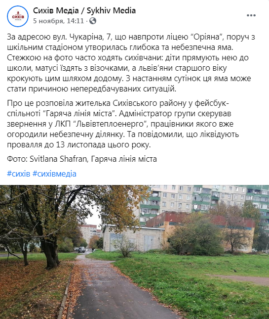 «За адресою вул. Чукаріна, 7, що навпроти ліцею “Оріяна”, поруч з шкільним стадіоном утворилась глибока та небезпечна яма. Стежкою на фото часто ходять сихівчани: діти прямують нею до школи, матусі їздять з візочками, а львів’яни старшого віку крокують цим шляхом додому. З настанням сутінок ця яма може стати причиною непередбачуваних ситуацій.