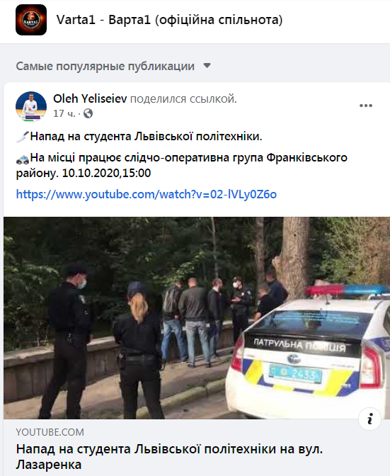 Oleh Yeliseiev оприлюднив відео у ФБ, яке було зроблено після прибуття правоохоронців на місце події.