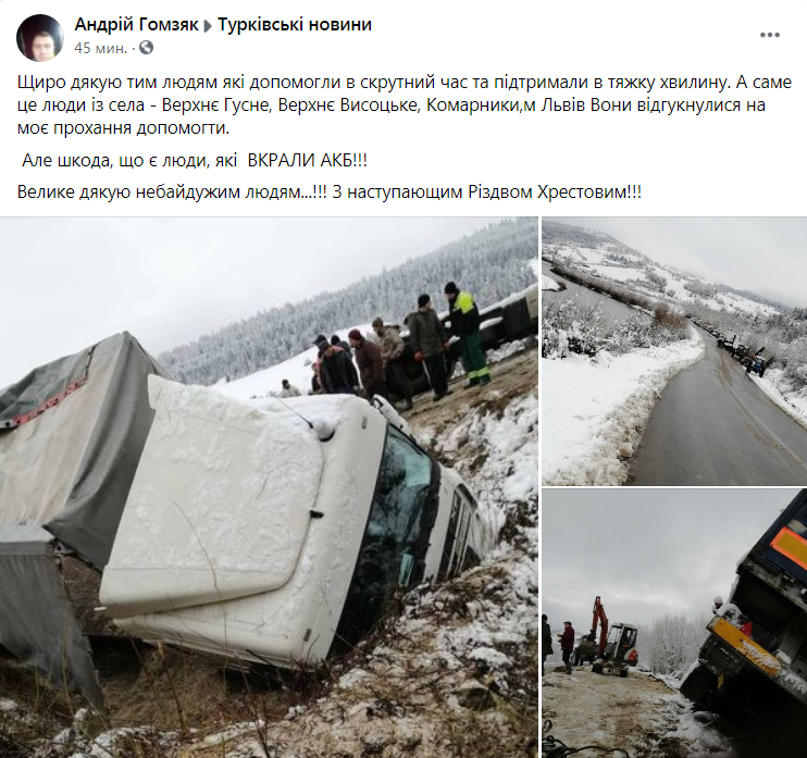 «Щиро дякую тим людям які допомогли в скрутний час та підтримали в тяжку хвилину. А саме це люди із села – Верхнє Гусне, Верхнє Висоцьке, Комарники,м Львів Вони відгукнулися на моє прохання допомогти. Але шкода, що є люди, які ВКРАЛИ АКБ! Велике дякую небайдужим людям. З наступающим Різдвом Хрестовим!»,- зазначив у дописі на своїй сторінці у ФБ Андрій Гомзяк, який оприлюднив світлини з місця події.