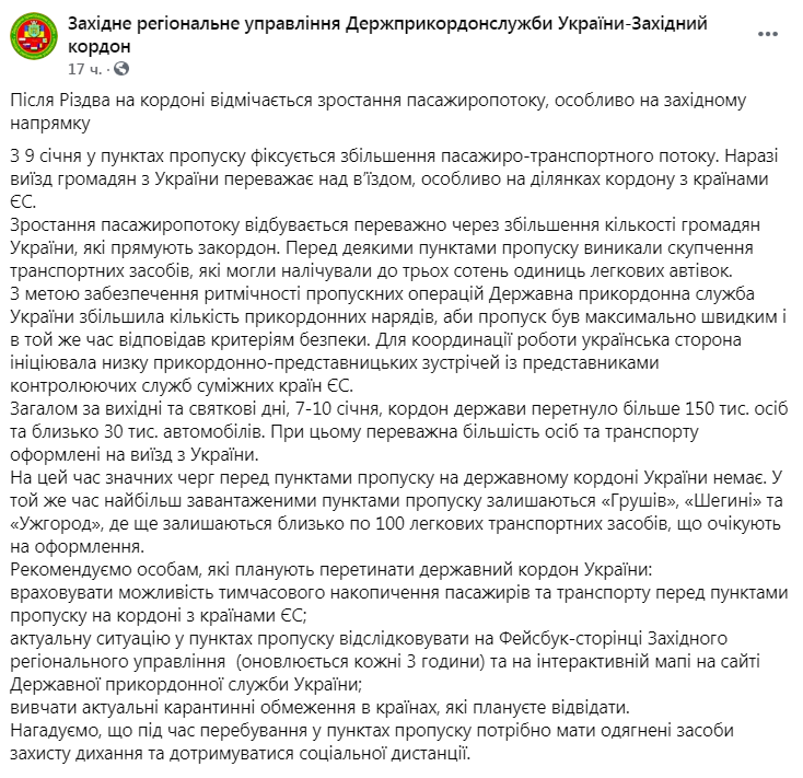 Загалом за вихідні та святкові дні, 7-10 січня, кордон держави перетнуло більше 150 тис. осіб та близько 30 тис. автомобілів. При цьому переважна більшість осіб та транспорту оформлені на виїзд з України.