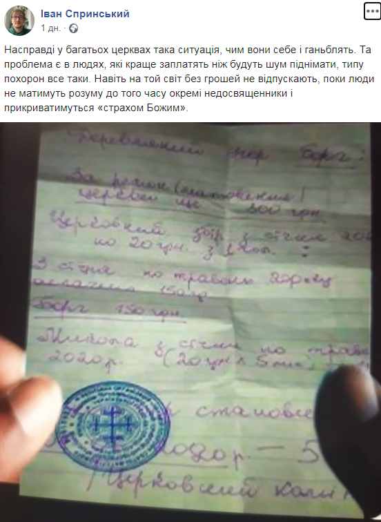 “Насправді у багатьох церквах така ситуація, чим вони себе і ганьблять. Та проблема є в людях, які краще заплатять ніж будуть шум піднімати, типу похорон все таки. Навіть на той світ без грошей не відпускають, поки люди не матимуть розуму до того часу окремі недосвященники і прикриватимуться «страхом Божим»“, – зазначив на своїй сторінці у ФБ коментуючи допис Іван Спринський.